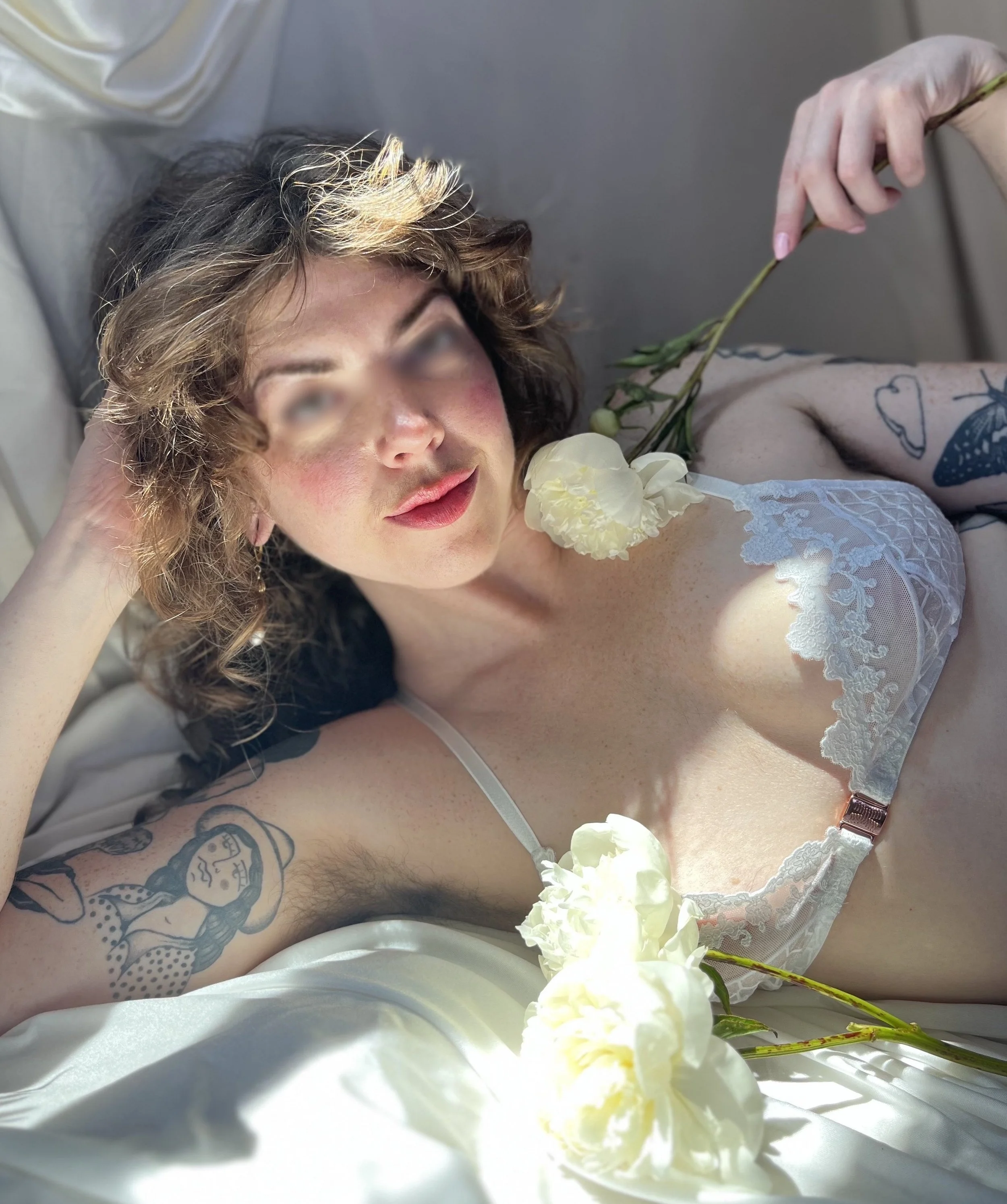 My visually striking auburn hair illuminates in the sun, which makes the countless freckles on my soft skin glow. My bodies delicate features are adorned with tattoos and naturally soft body hair. You will experience euphoria by my sweet aromas, while my full lips and smile melt and put you at ease. Let my tenderness draw you in, before my sensual darkness overtakes you.